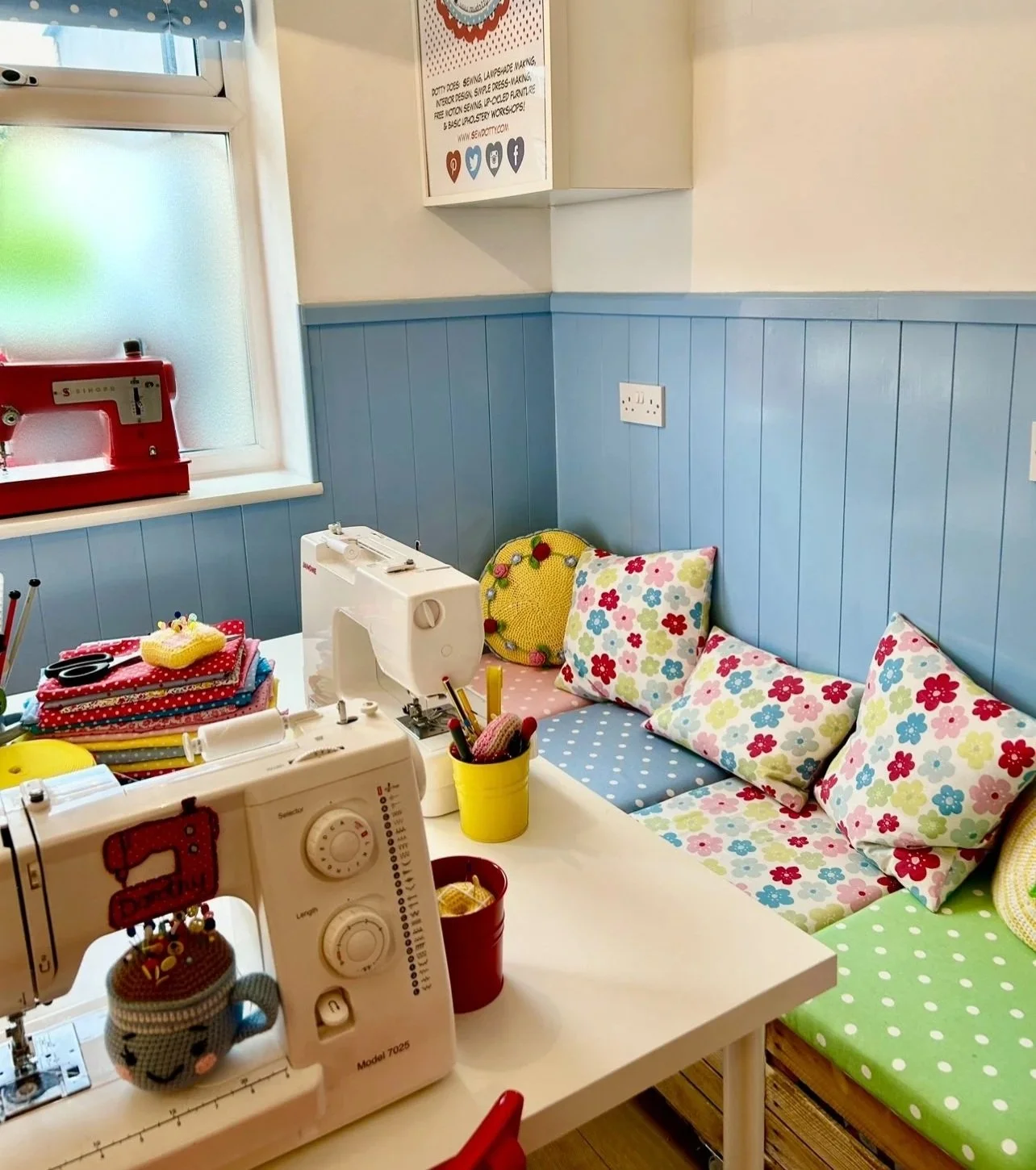 Made-to-measure soft furnishings, quilting, patchwork, cross stitch, crochet, blinds, cushions, lampshades, upholstery, upcycling furniture, free motion sewing, interior design & sew on!